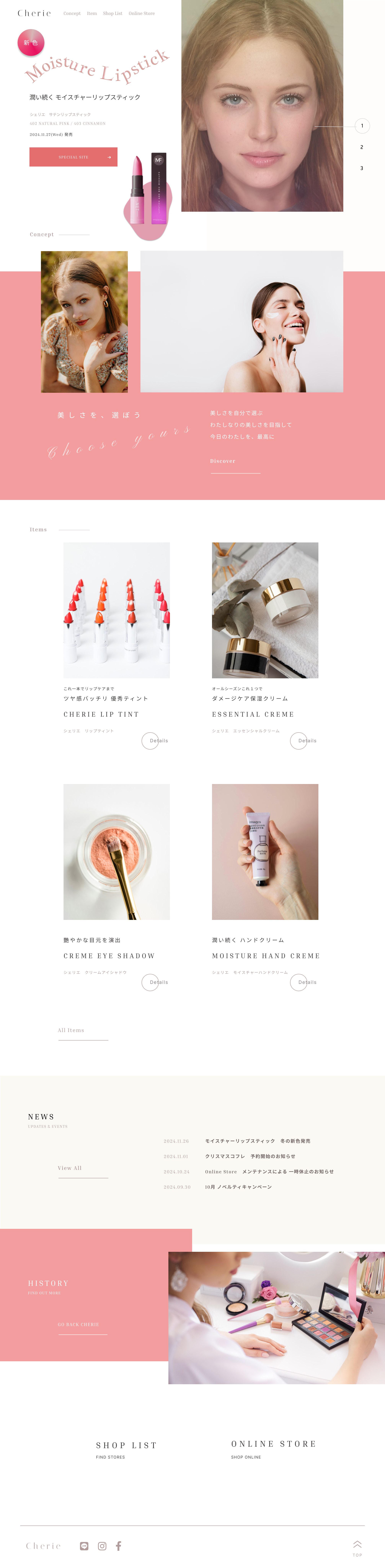 自主制作で”Cherie”という架空のコスメブランドのLPを作成しました。TOPには新商品の情報を大きく載せて、見ている方の購買意欲を促すよう、新商品の写真も入れました。発色の度合いや商品の外観がわかりやすいように、全体的に写真を多めに取り入れています。
